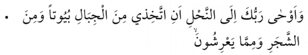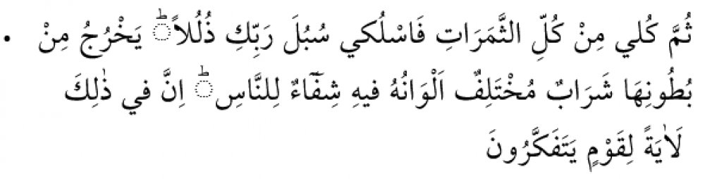 "Senin Rabbin bal arısına şöyle vahyetti: «Dağlardan, ağaçlardan ve insanların kuracakları kovanlardan, çardaklar dan evler edin. Sonra meyvelerin hepsinden ye de Rabbinin kolayca olan yollarına git. İçlerinden renkleri muhtelif olan bir şerbet çıkar, onda insanlar için bir şifa vardır. Şüphesiz ki, bunda tefekkür eden bir kavim için elbette bir ibret vardır."